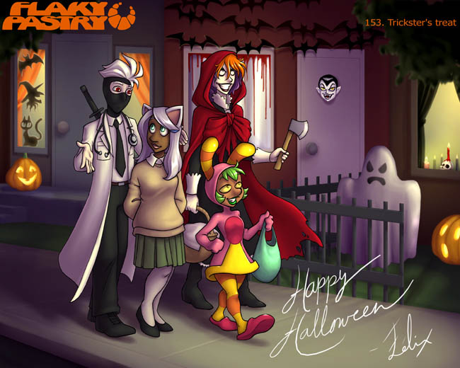 Halloween! It's tomorrow, but you still get a shiny picture today. It's the main cast of Flaky Pastry, out trick-or-treating! Probably Nitrine dragged them all out. And of course, it's also available as a wallpaper! I say of course, but I didn't think of it in previous years when I did specials like this. I should probably get around to correcting this soon.