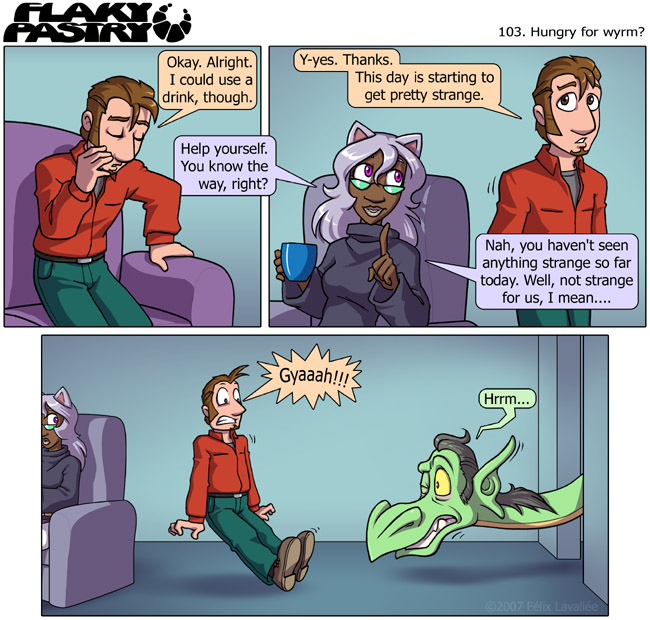 Comic Updated! The Ferrett has written a largely positive review of Flaky Pastry, which also doubles as an editorial on the appeal and necessity of both serious comics and funny comics (I'll let you guess which category Flaky Pastry fits into), and the analysis thereof. This is the first review I've gotten, as in something more than one or two sentences, and not written by someone I know. And this is cool! So, thank you, The Ferrett! And as always, welcome to new readers! The comic is there for you, every friday night (saturday morning?), and you're more than welcome to post on the forum if you have comments!