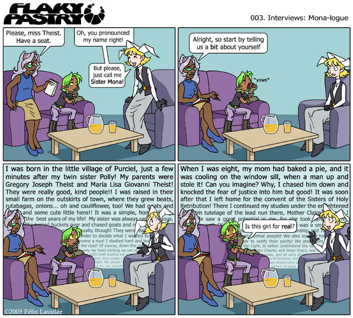 Well, I've led up to this quite blantantly in the first two strips, but starting now and for a few weeks, Nitrine and Marelle will interview potential room mates. Exciting!