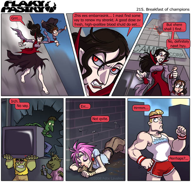 And IN ADDITION to the usual Flaky offering, you can take a look at my entry for Rogue Skies, which is a thing I joined for fun over on deviantArt. Like I said a few weeks ago, if you recognize any of the characters I use there it must be a coincidence! I greatly appreciate comments and cheering on, even though in the end, the winners are decided by a panel of judges and not by popular vote. ;) I strongly encourage you to check out my opponent's version of that fight, as well as the many other entries - as many as you have time to read (and more)! They're all listed over here.