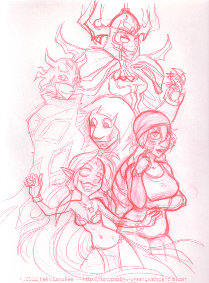 With Halloween getting closer, I thought I'd share an old sketch for a fun wallpaper concept that was never used. The four Fiends of the Elements (+Golbez) from Final Fantasy 4... Nitrine as Barbariccia, Marelle as Cagnazzo, Kurt as Scarmiglione, the neighbour as Rubicante, and Zintiel as Golbez. Kind of felt too obscure at the time (and still today), in addition to this not being a great layout for a desktop wallpaper. But pretty cool I like to think.